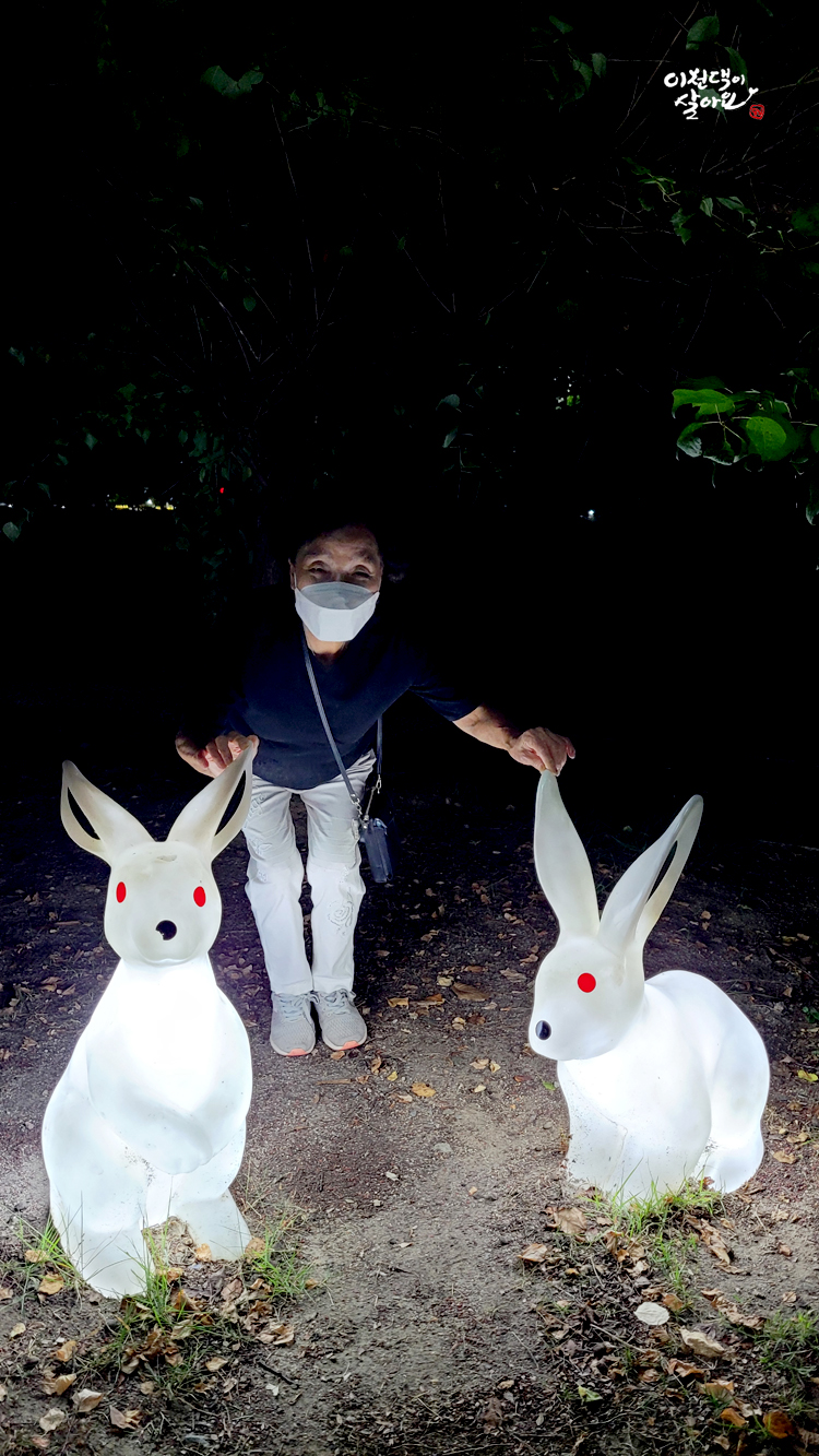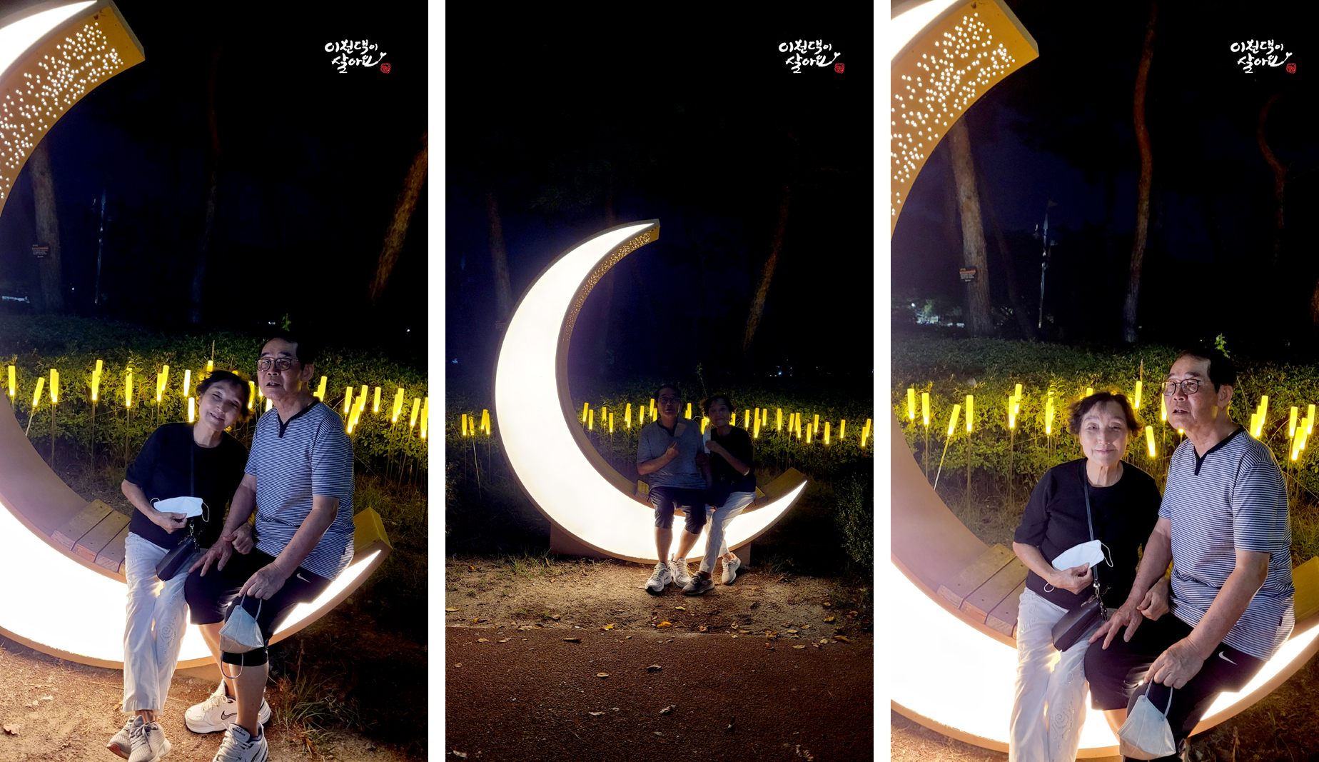 예쁜 조명으로 시선을 끄는 초승달 벤치에 앉아봅니다.