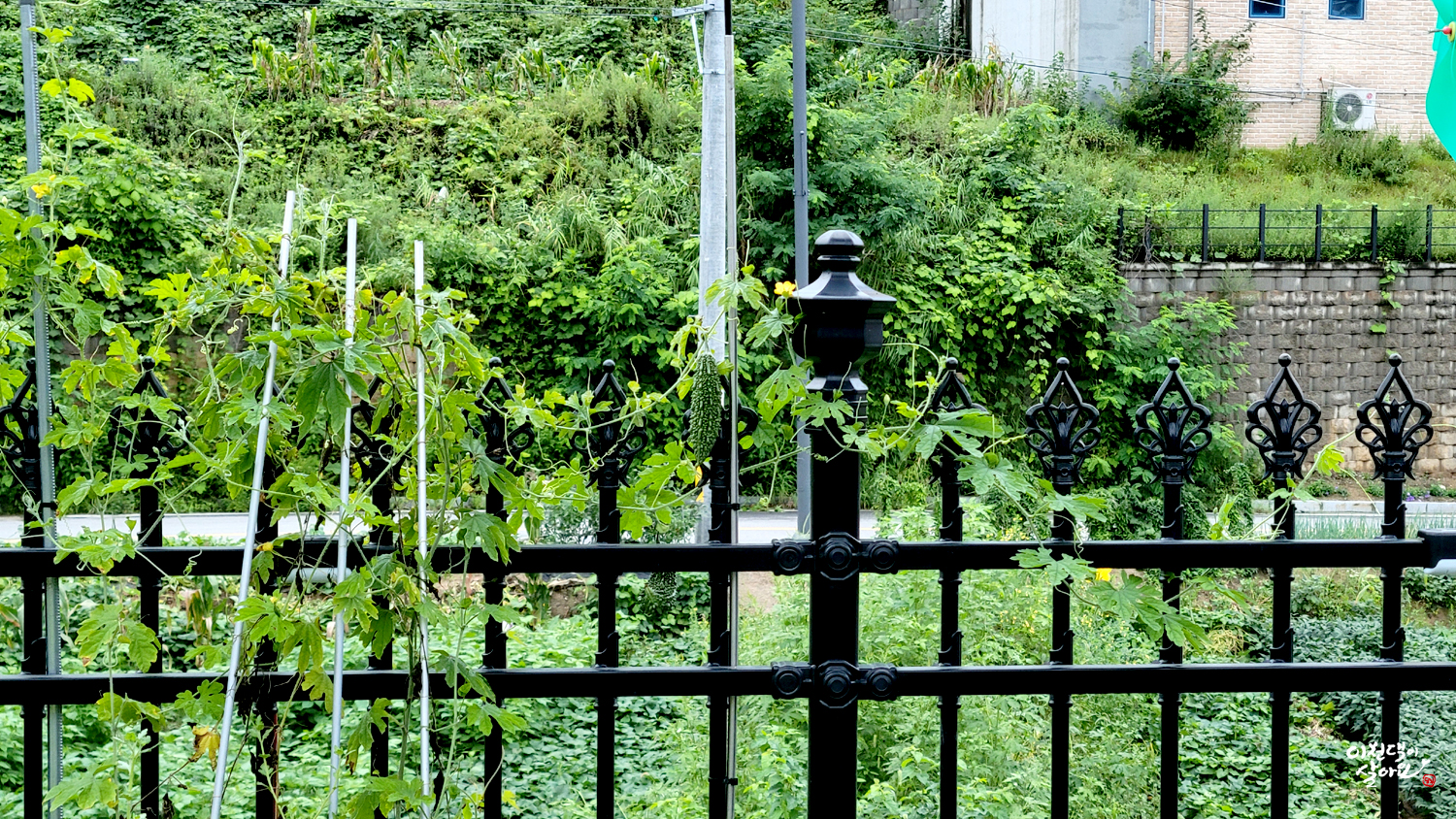 소나무 뒤편에 철제 난간을 타고 올라가는 더덕 넝쿨을 바라봅니다.