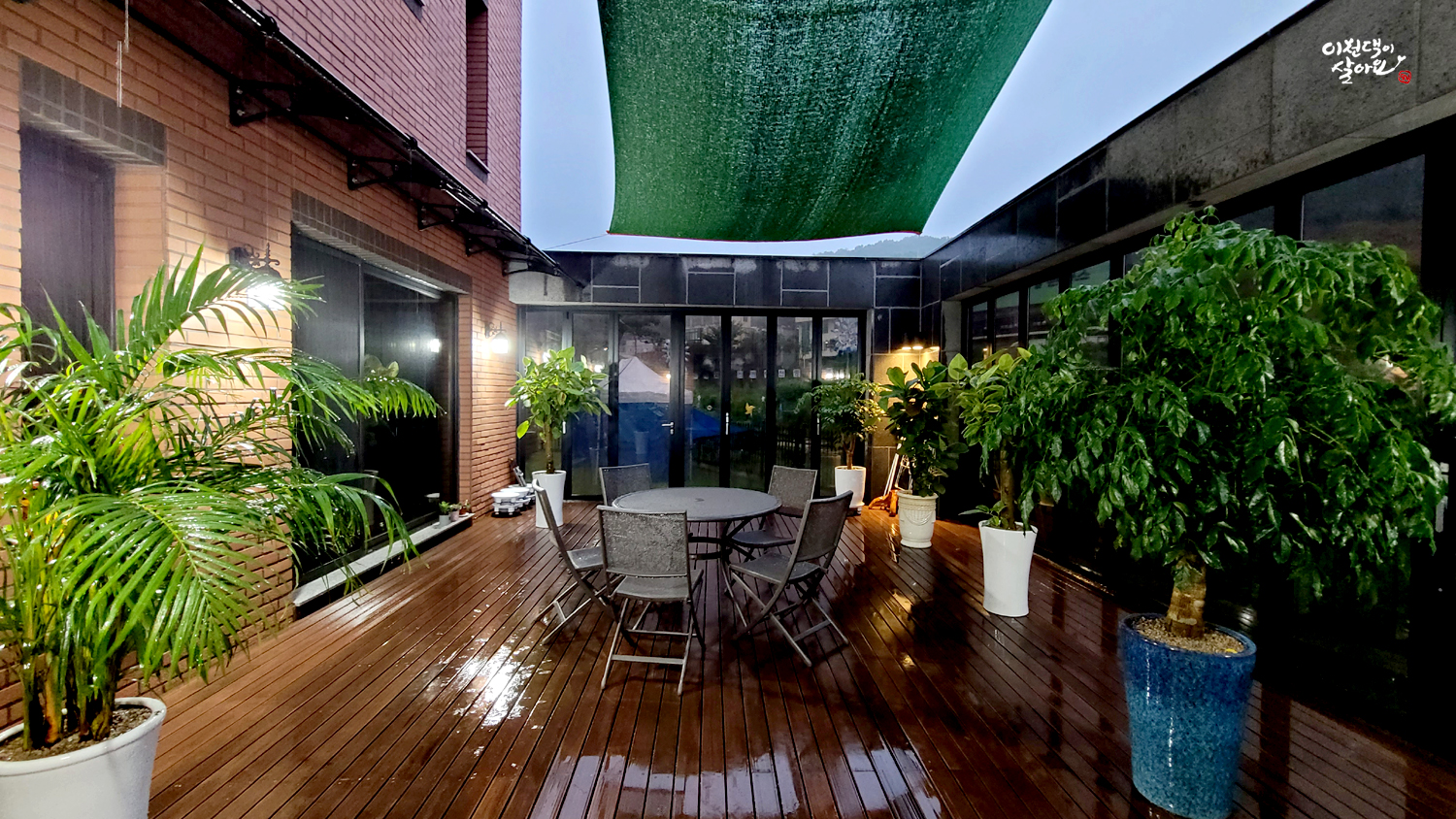 중정 마루바닥에 부딪히는 우렁찬 빗방울 소리에 잠에서 깨어
