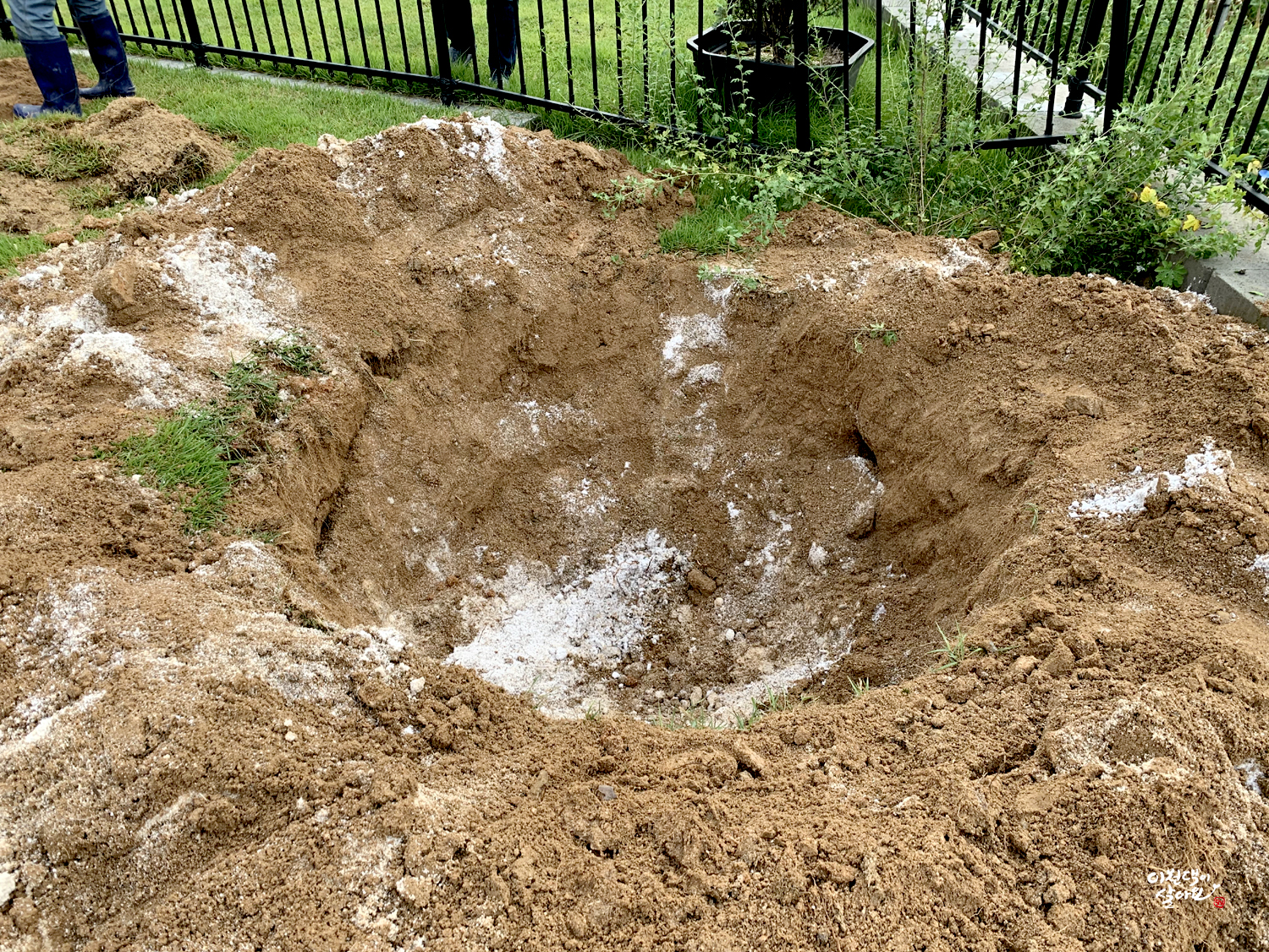 축대 안쪽 꺼진 땅을 보수하기 위해 잔디를 걷어내고 있습니다.