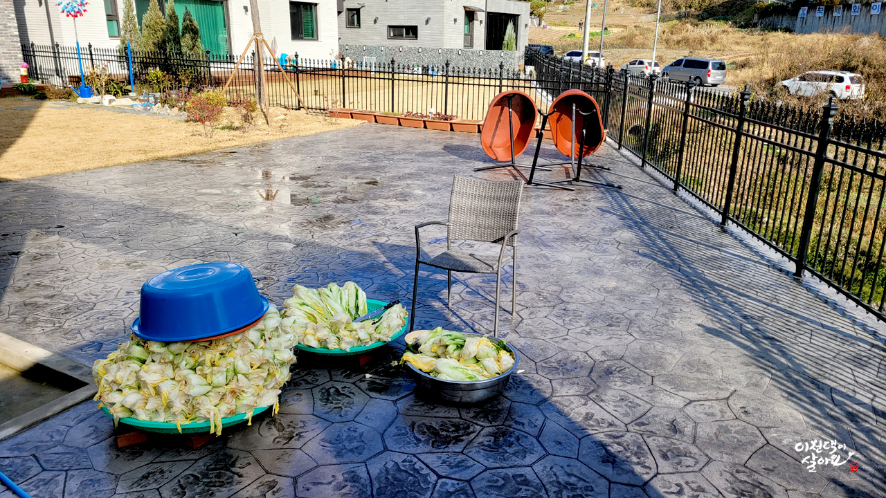 사가지고 온 배추를 마당에 옮겨 놓았습니다.