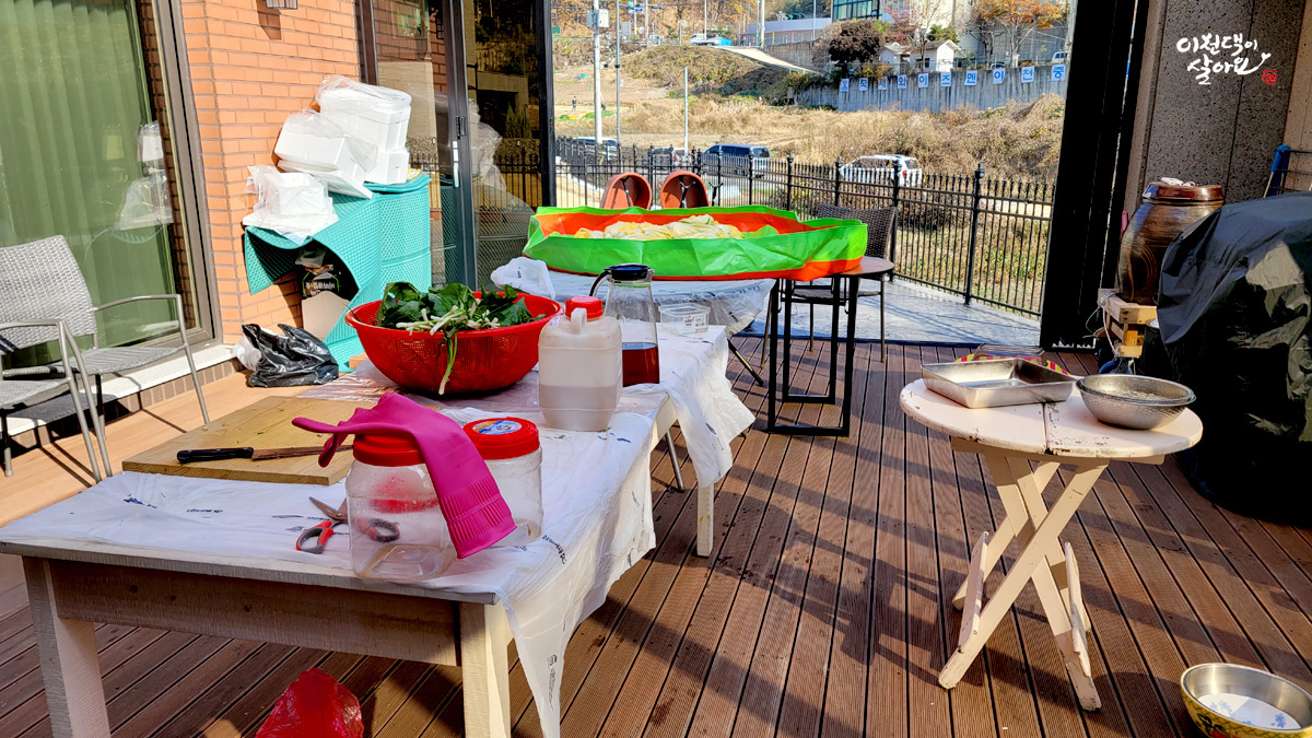 배추와 버무리는 작업을 하기위해 이것저것 중정에 가져다 놓았습니다.