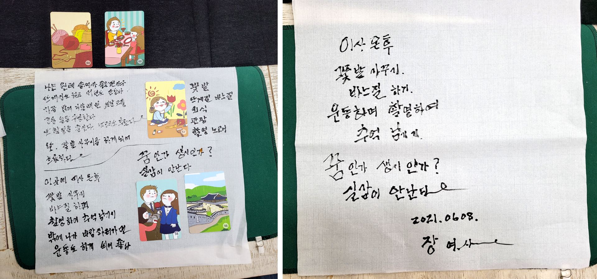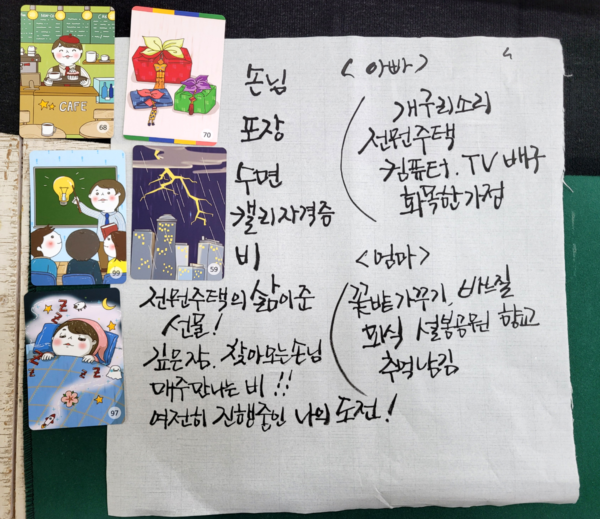 다섯개의 카드를 고르고 대표 단어를 적고 이야기를 만들어 보았습니다.
