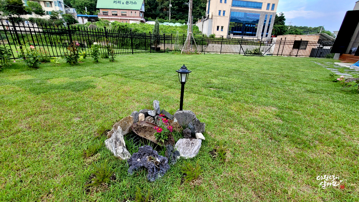 정원 중앙의 돌과 화분이 있는 곳입니다.
