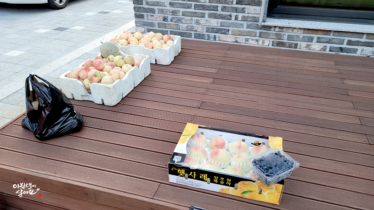 그 복숭아를 나누어 받는 이웃의 반가운 표정 ~